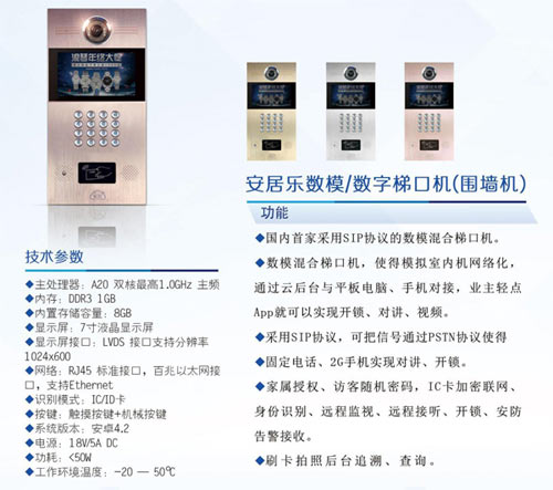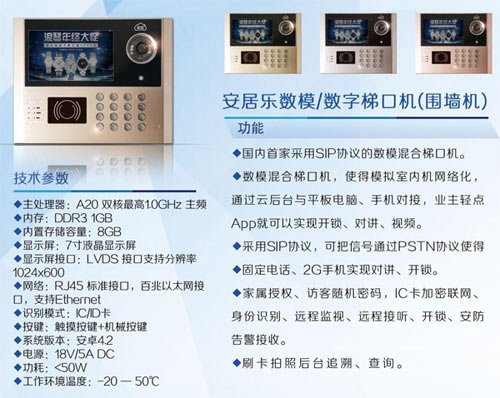 安居樂數(shù)字對(duì)講系統(tǒng)把模擬信號(hào)和數(shù)字信號(hào)融為一體,安居樂數(shù)字后臺(tái)搭建業(yè)主、物業(yè)管理、周界商圈、廣告經(jīng)營、O2O的大數(shù)據(jù)交流平臺(tái),充分發(fā)揮各自優(yōu)勢資源,共同營造增值空間,體現(xiàn)各自社會(huì)價(jià)值。讓用戶切身體驗(yàn)到:"家就在眼前,社區(qū)就在身邊,世界就在指尖,生活就在安居樂。"