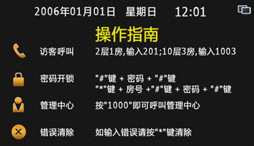 1) 門口機(jī)待機(jī)時的主界面,包括時間日期顯示,網(wǎng)絡(luò)是否在線,訪客呼叫、密碼開鎖、呼叫中心以及使用說明,如圖3.1.1: