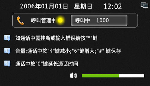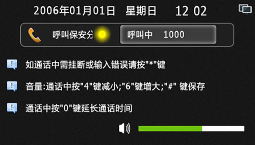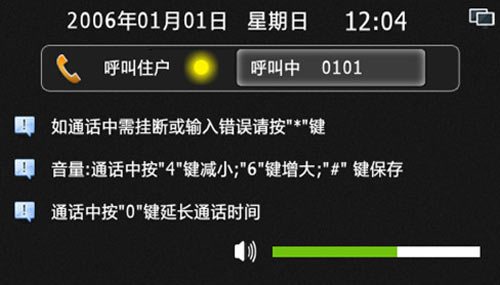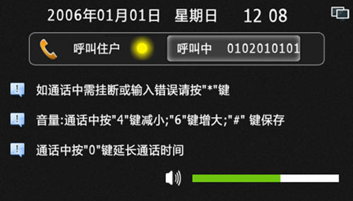 4) 輸入房號時錯誤,可按“*”鍵清除,呼叫或通話過程中按“*”鍵可退出或結(jié)束通話,通話中按“4”或“6”可減小或增大音量,通話中按“0”鍵可延長通話時間至60秒。