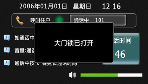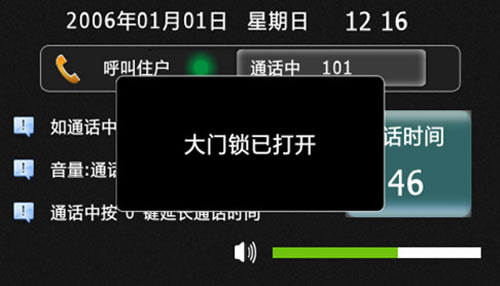 6) 呼叫業(yè)主或和業(yè)主通話時,業(yè)主通過室內(nèi)機(jī)遠(yuǎn)程開鎖,門口機(jī)將顯示“大門鎖已打開”如下圖3.2.5:
