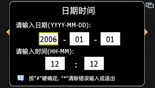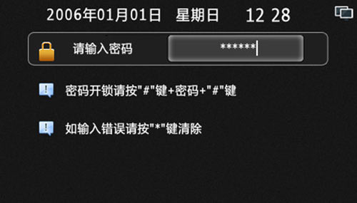 1) 設(shè)置機(jī)器的時間和日期,如果設(shè)置時間不合理,則會提示設(shè)置失敗。設(shè)備開機(jī)或運(yùn)行時會自動同步物業(yè)中心軟件的時間。格式為安居樂X-XX-XX XX:XX,例如2006-1-1 12:00,“*”鍵可清除錯誤輸入,“#”確定保存并退出,設(shè)置界面如圖4.10.1: