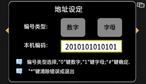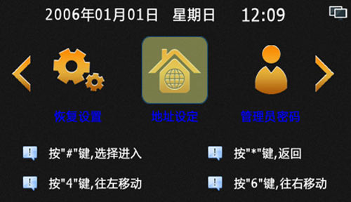 1) 進(jìn)入系統(tǒng)設(shè)置:主界面輸入“#”+6位管理員密碼+“#”(出廠默認(rèn)管理員密碼為666666),進(jìn)入系統(tǒng)設(shè)置界面,“*”鍵退出或清楚錯誤輸入功能,“#”鍵為確定功能,“4”和“6”左右移動選擇,進(jìn)入時默認(rèn)為地址設(shè)定,如圖4.1.1: