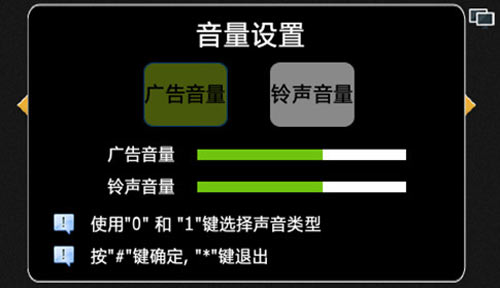 1)可設(shè)置廣告音量和鈴聲音量,按“0”選擇廣告音量選項,按“1”選擇鈴聲音量選項,按“4”減小音量,按“6”增加音量,如圖4.6.1: