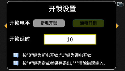 1) 設(shè)置電控鎖的開鎖方式以及開鎖延時,默認(rèn)為通電開鎖,延時為10秒,。按“0”選擇斷電開鎖,按“1”選擇通電開鎖,按“#”進(jìn)入開鎖延時選項,輸入延時后按“#”鍵保存(延時范圍為1-150秒),按“*”鍵可清除錯誤輸入或退出開鎖設(shè)置界面,如圖4.7.1: