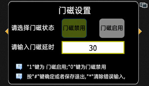 1) 設(shè)置門磁的啟用和禁用狀態(tài),以及門磁的延時。默認(rèn)門磁為禁用,延時為30秒,按“0”選擇門磁禁用,按“1”選擇門磁啟用,“*”鍵清除延時時間或退出門磁設(shè)置界面,“#”鍵保存設(shè)置并退出,如圖4.8.1: