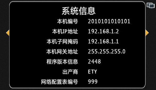 1) 可查看當(dāng)前設(shè)置的系統(tǒng)信息,包括房號,IP地址,子網(wǎng)掩碼,網(wǎng)關(guān)地址,程序版本,出場商,網(wǎng)絡(luò)配置表型號,按“*”鍵退出查看界面,界面如圖4.11.1: