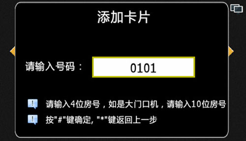 2) 添加IC卡操作:輸入需要添加IC卡的房號,如果是在單元機(jī)上,輸入4位例如0101,如果是在圍墻機(jī)上,輸入10位房號例如0102010101(1區(qū)2棟1單元101戶),按“#”鍵確認(rèn),如圖4.12.2: