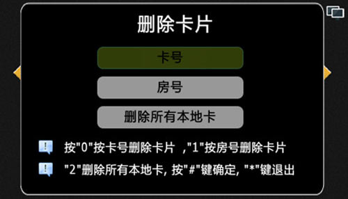 4) 按“1”選擇刪除卡片,進(jìn)入下一級菜單,如圖4.12.4,按“0”按照卡號來刪除卡片,按“1”按照房號來刪除卡片,按“2”刪除所有本地發(fā)出的卡片。