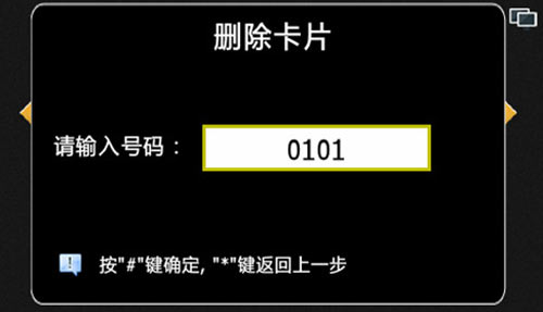 按“1”+“#”選擇房號后,輸入需要刪除所有卡對應(yīng)的房號,如果在單元機(jī)上需輸入4位房號,例如0101,如圖4.12.6,如果在圍墻機(jī)上需輸入10位房號,例如0102010101。若該房號存在IC卡,則刪除該房號的所有住戶IC卡;若輸入的房號沒有卡片,則提示輸入的房號沒有卡片,如圖4.12.7: