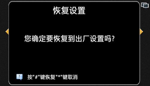 1) 點擊恢復(fù)設(shè)置按鈕,選擇是否恢復(fù)到出廠設(shè)置,按“#”確定恢復(fù)出廠,按“*”取消恢復(fù)出廠,如圖4.13.1: