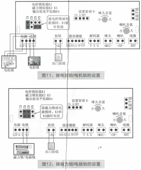 主機主板上的"K1-K4"插針(如圖10所示)是設(shè)置開鎖信號的,出廠時主機默認是接普通電鎖的(默認是短接K1,如圖11所示),如果使用磁力鎖或電插鎖,那么把插針帽換插到"K2"和"K3"插針的位置(即短接"K2"和"K3"插針,如圖12所示),如果需要輸出低電平信號,那么短接"K4"插針即可.