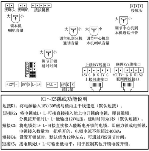 1)安裝施工調(diào)試時(shí),安裝工作人員可以根據(jù)現(xiàn)場(chǎng)環(huán)境的需要進(jìn)行一些調(diào)整,比如:通話聲音過大或過小,可以微微調(diào)整電位器(如下圖所示),一般不用調(diào)整。