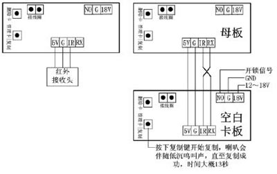 5、數(shù)據(jù)復(fù)制:一條4P對(duì)4P的線把2個(gè)刷卡板連接在起來(lái),如下圖所示。在空白板刷卡板上供電,供電后按一下空白刷卡板上的復(fù)制按鍵,聽到喇叭響約13秒后停止,數(shù)據(jù)即復(fù)制成功,這時(shí)2個(gè)刷卡板的卡數(shù)據(jù)相同。在多門口要求卡相同可以快速?gòu)?fù)制而不用每臺(tái)主機(jī)都用管理卡增加;