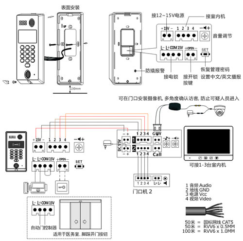 門口機(jī)功能: 可接室內(nèi)機(jī), 可實現(xiàn)呼叫、視頻傳輸、雙向?qū)χv、開鎖功能。