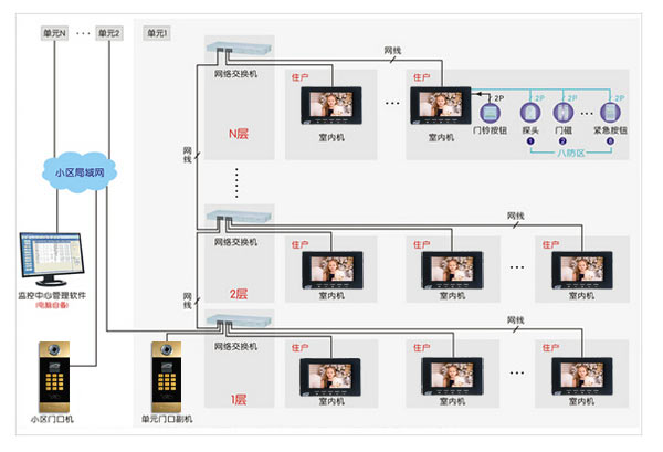 3.若正常工作說明門口主機及線路和設(shè)備是正常的;接著切斷系統(tǒng)電源,再連接好上一層系統(tǒng)的主線路,進(jìn)行第二層調(diào)試(系統(tǒng)接線時一定要斷電),依次往上調(diào)。